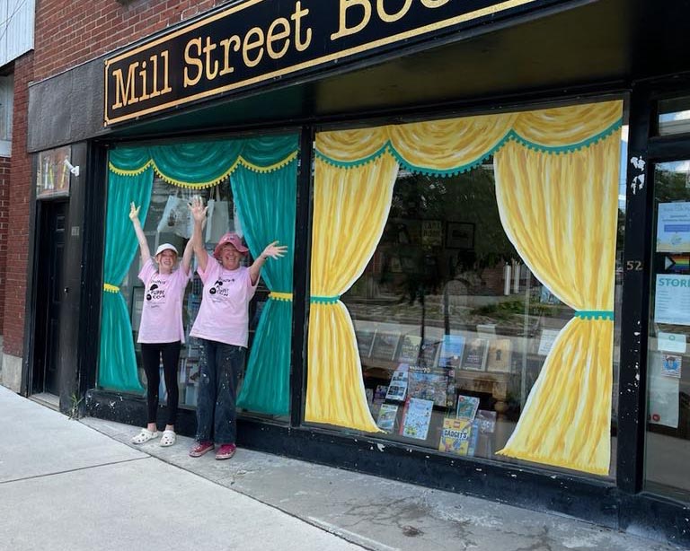 “I really like artistic things” says Adelaide Gorman, “and I wanted to help Puppets Up!” Heck, Adelaide was so keen that her Grammy — the wonderful Joan Cox, also known as “Head Volunt-hero Wrangler” — decided to cheer her on as she transformed the Mill Street Books windows. “Such fun,” says Adelaide with a grin, “Hope you’ll ask me to paint windows again.”